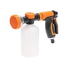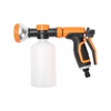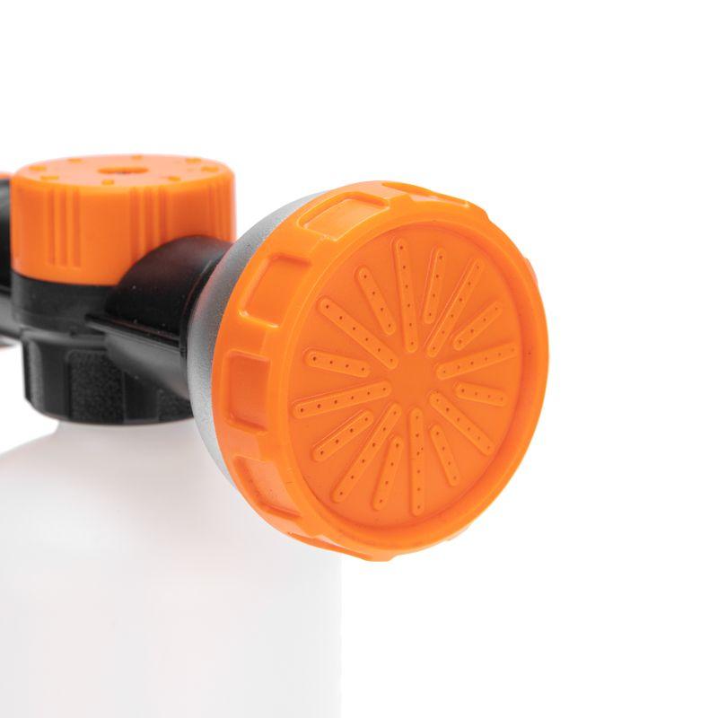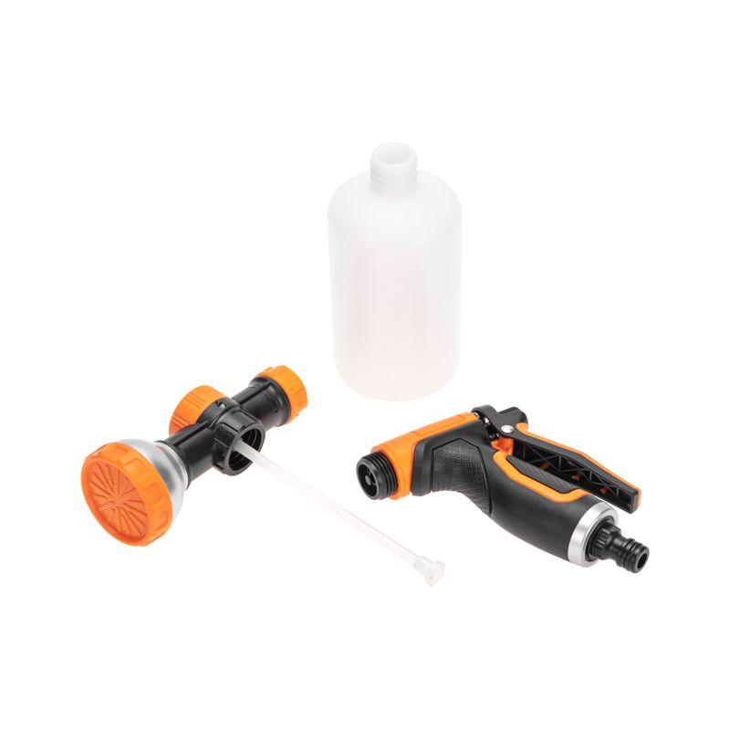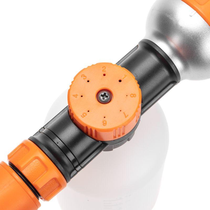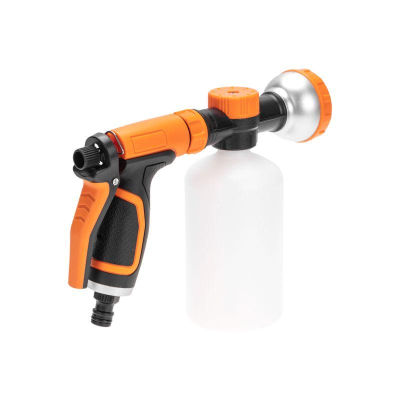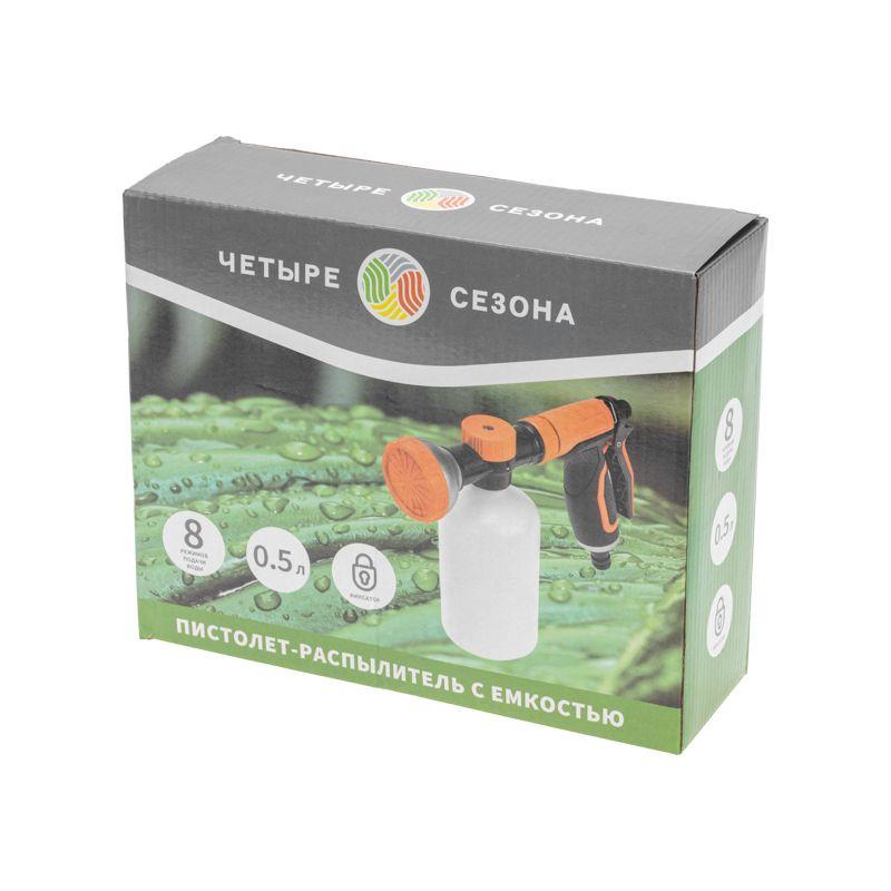 Пистолет-распылитель с резервуаром позволит полить растения с добавлением удобрений или же помыть что-то с моющим средством. Благодаря специальной емкости не требуется предварительное смешивание. Необходимо просто добавить в резервуар удобрение или моющее средство и включить воду, после чего смешивание будет происходить самостоятельно. На корпусе устройства располагается регулятор, который позволяет контролировать интенсивность полива в зависимости от потребностей. Прорезиненная рукоятка обеспечивает комфорт и удобство при длительной работе в саду. Использование пистолета-распылителя с резервуаром позволяет легко и равномерно наносить питательные вещества во время полива. Такой подход стимулирует активный рост и развитие растений.