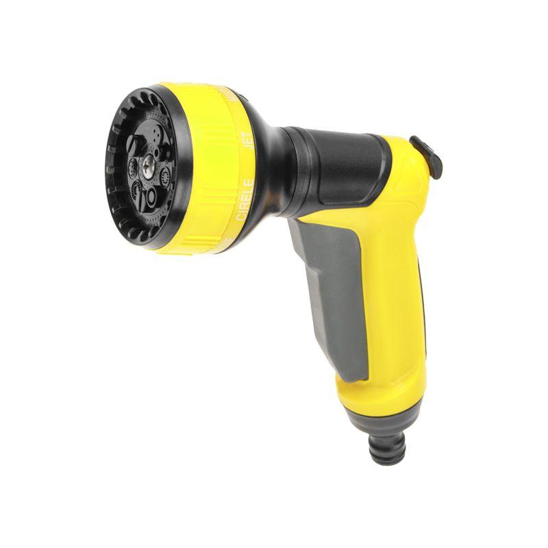 Пистолет-распылитель представляет собой садовый аксессуар, предназначенный для полива растений и почвы. Пистолет оснащен эргономичной прорезиненной ручкой, благодаря которой его удобно и комфортно держать в руке даже на протяжении длительного времени. Имеет 7 режимов подачи воды, регулируемых поворотной головкой. Легко нажимаемый курок делает процесс полива удобным и простым. Регулировка давления позволяет адаптировать интенсивность подачи воды в зависимости от конкретных потребностей. Изделие надежно и герметично крепится к шлангу при помощи универсального соединителя, расположенного на конце пистолета.