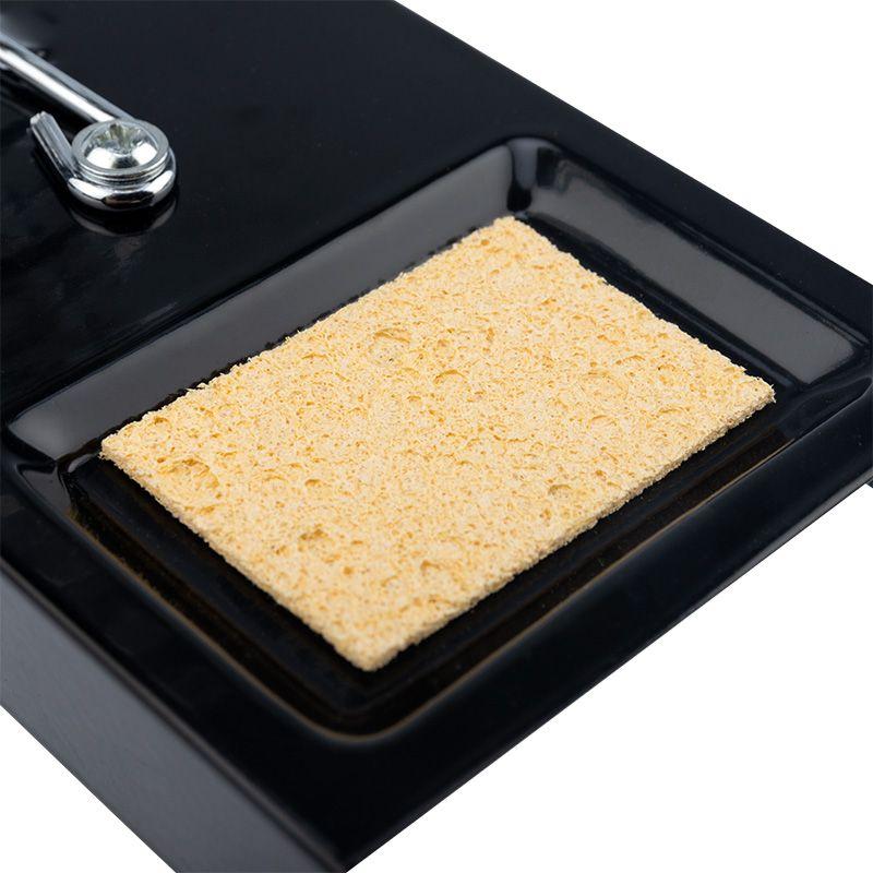 Подставка под паяльник REXANT предназначена для безопасного хранения паяльника при нагревании, в промежутках между использованием и охлаждении. Выполнена из витой хромированной конусообразной пружины и металлической платформы с ложементом под губку для очистки жала паяльника от остатков припоя. Губка для очистки жала паяльника в комплекте. Габаритные размеры губки: 51 х 36 х 1.9 мм. Паяльник легко и удобно помещается в направляющую. Для безопасного хранения и бережной транспортировки предусмотрена картонная коробка.