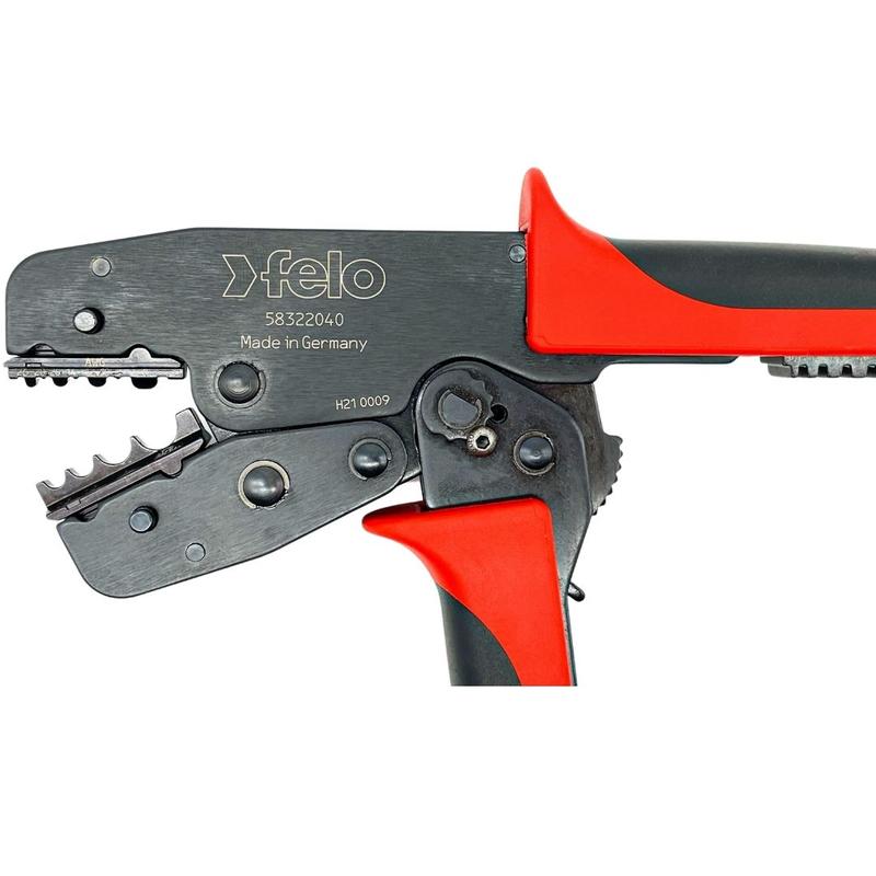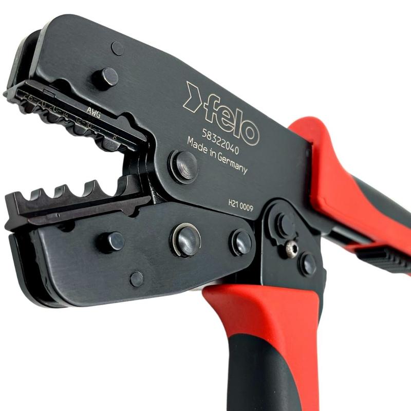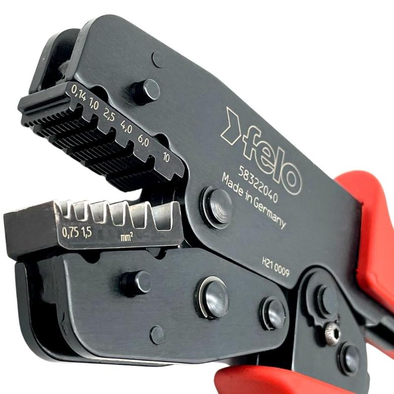 Пресс-клещи FELO 58322040 предназначены для опрессовки штекеров и кабельных, кольцевых наконечников. Инструмент имеет долгий срок службы, так как изготовлен из хромованадиевой инструментальной стали, закаленной в масле. Инструмент оснащен пружиной для быстрого раскрытия. Передаточная многорычажная система позволяет передавать на инструмент большое усилие при работе. Сменные насадки в комплекте пресс-клещей позволяют работать им методом овального обжима в диапазоне от 0,75 до 10 кв.мм. 1 Матрица: для обработки кабельных наконечников DIN с красной/синей/желтой изоляцией, штыревые кабельные наконечники, плоские вилки, плоские розетки, круглые штекеры, круглые розетки, стыковые и параллельные разъемы Профиль 1: красный 0,5-1,0 кв.мм Профиль 2: синий 1,5-2,5 кв.мм Профиль 3: 4,0-6,0 кв.мм 2 Матрица: для обработки наконечников проводов без изолирующей манжеты согласно DIN 46228, диапазон сечений 0,14 - 10,0 кв.мм 3 Матрица: для обработки неизолированных кабельных наконечников, поперечное сечение 0,1 - 10,0 кв.мм
