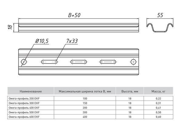 "Омега профили предназначены для легких нагрузок и могут быть смонтированы как к стене, так и к потолку. Они обеспечивают надежный и быстрый монтаж металлических кабельных лотков любой ширины. Имеют удобную перфорацию под анкерные болты или шпильки М10. Стандартная толщина профилей - 1,5 мм. Кабельные лотки EKF-Line крепятся к профилям стандартным комплектом метизов wgm6x16."