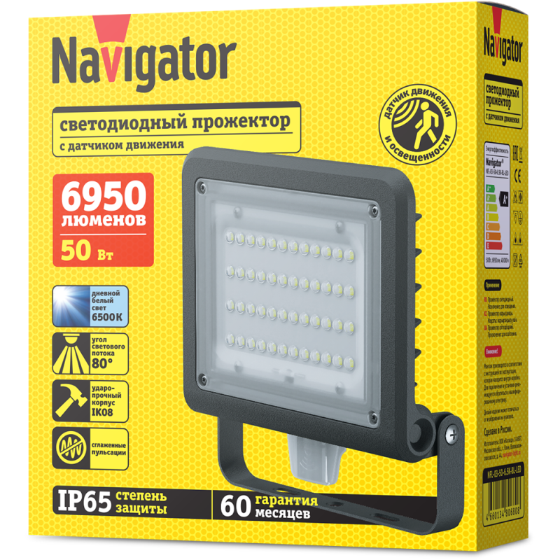 Прожектор светодиодный 80 680 NFL-03-50-6.5К-BL-LED 50Вт 6500К IP65 6950лм с датчиком черн. Navigator 80680