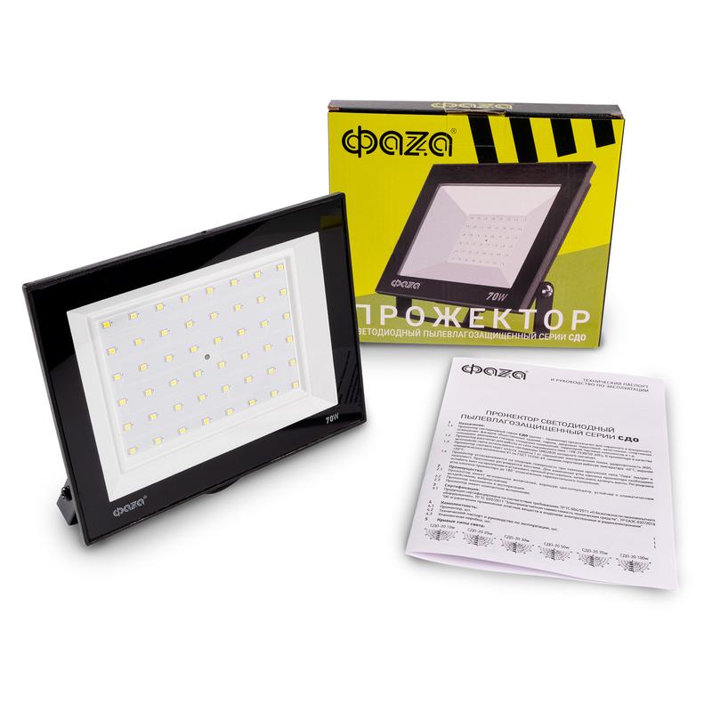Прожектор светодиодный СДО-20 70Вт 6500К IP65 230В BL ДО прозр. закален. стекло ФАZА 5047327