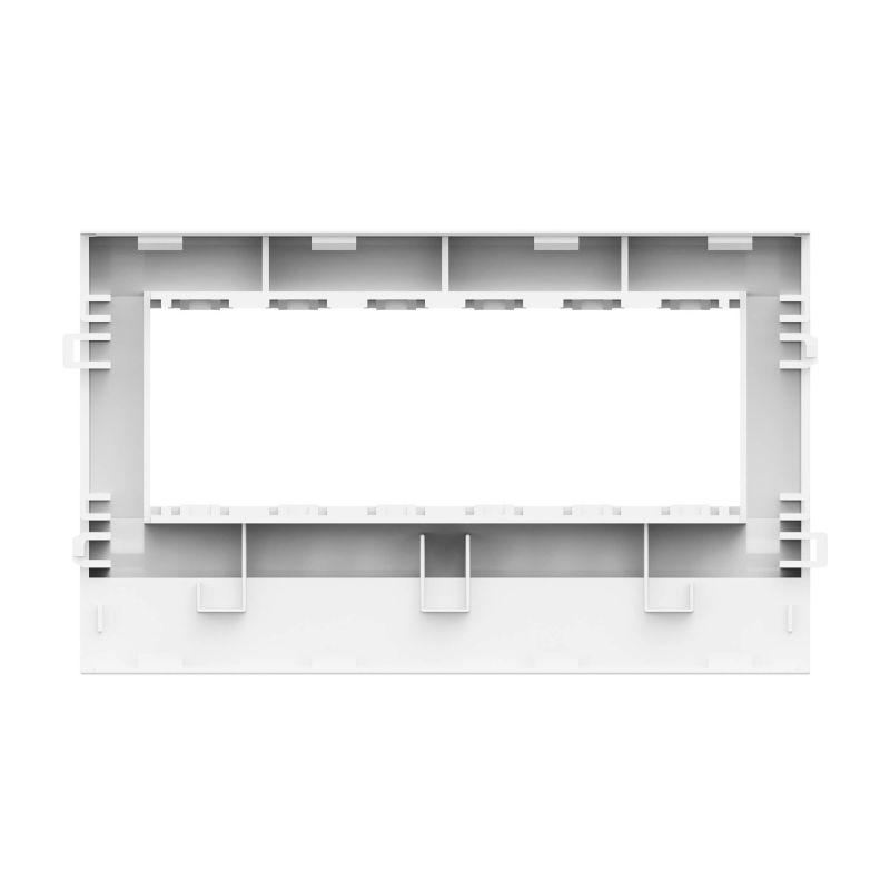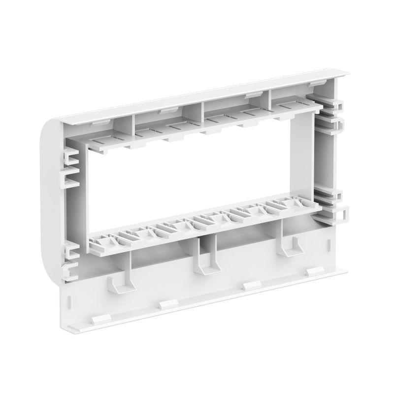 Рамка-суппорт на 6 модулей, PDA-3BN. Назначение: организация рабочих мест - монтаж электроустановочных изделий в пластиковые короба, тип TA-GN серии "In-liner Classic". Монтаж: монтаж суппорта внутри короба с помощью защелкивания, монтаж электроустановочных изделий в рамку - защелкиванием снаружи. Характеристики: материал – АБС-пластик и поликарбонат. Комплектация: рамка; суппорт. Типоразмер короба: 100х40, 100х60, 100х80. Цвет: белый