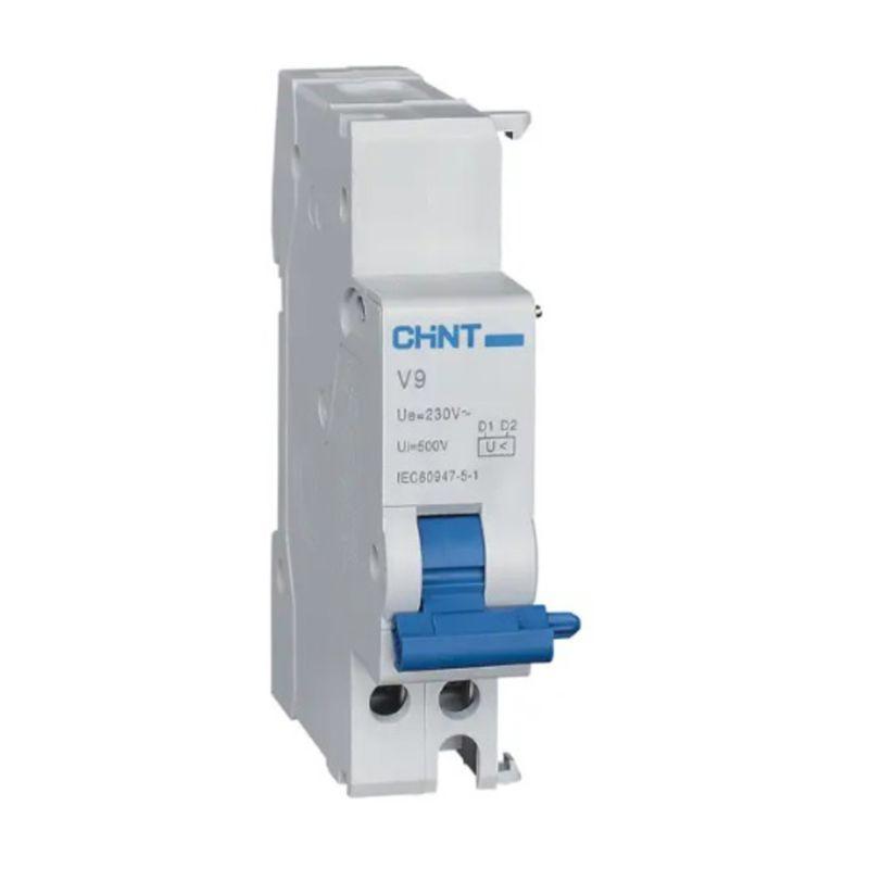 Расцепитель минимального напряжения серии V9 предназначен для аварийного отключения автоматического выключателя при обнаружении снижения фазного напряжения, также может быть использован для дистанционного отключения автоматического выключателя. При установке расцепителя минимального напряжения включение автоматического выключателя возможно только при наличии напряжения на расцепителе. При обрыве цепи управления, отсутствии напряжения питания, а также при значительном снижении уровня напряжения происходит автоматическое отключение выключателя. Расцепитель устанавливается с левой стороны выключателя и прищелкивается к нему. Основные характеристики: Напряжение управления – АС230В Напряжение отключения – 0,7–0,35 Us Напряжение гарантированного невключения – 0,35 Us Напряжение неотключения – 0,85–1,10 Us Механическая износостойкость – 4000 циклов В/О Электрическая износостойкость – 4000 циклов В/О Степень загрязнения – 2 Степень защиты – IP20 Ширина – 18 мм Монтаж – на симметричную DIN-рейку 35 мм Расцепитель минимального напряжения серии V9 может применяться с выключателями следующих серий NB1L, NB1L-40, NB1L-63, NB310L, NBH8LE-40, NB1-63, NB1-63H, NB1-63DC, NB8-40J, NB8-63M.