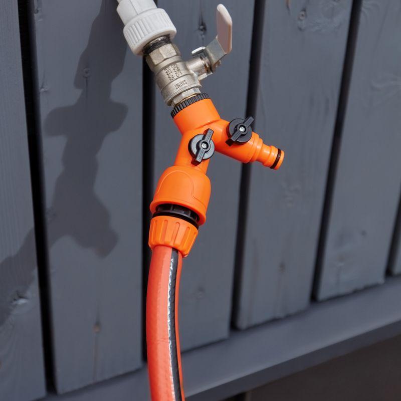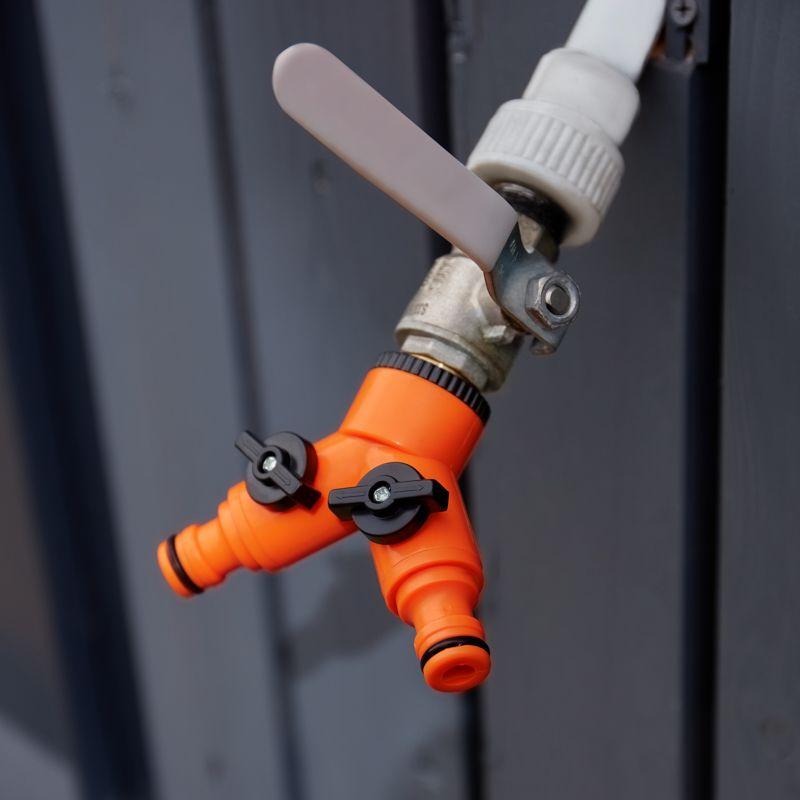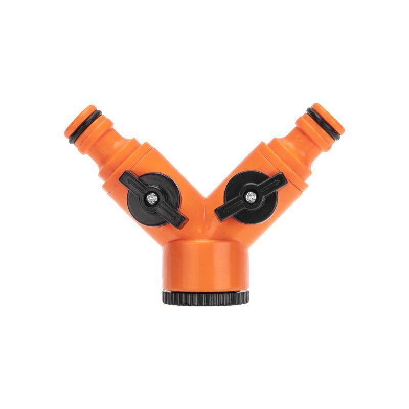 Разветвитель представляет собой изделие, предназначенное для подключения двух шлангов через коннекторы к крану с внешней резьбой. Применяется при организации систем полива и систем водоснабжения. На корпусе разветвителя располагаются два вентиля, что позволяет регулировать напор воды или же полностью перекрывать ее подачу. Разветвитель выполнен из качественного и прочного пластика, устойчивого к воздействию внешних факторов. Обеспечивает надежное и герметичное соединение за счет резиновых уплотнителей. Изделие просто и быстро устанавливается вручную без использования специальных инструментов и крепежных элементов.