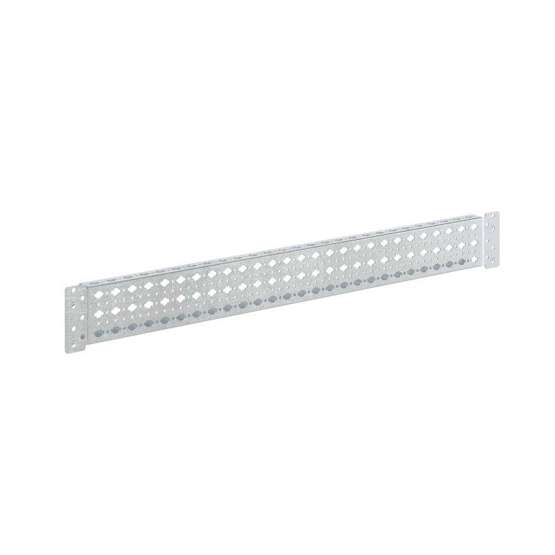 Широкая боковая рейка предназначена для установки оборудования и усиления конструкции внутри корпуса. В комплект входят 4 рейки и монтажные аксессуары. Материал — оцинкованная сталь толщиной 1,5 мм, с перфорацией шагом 25 мм. Конструкция имеет три монтажные плоскости и устанавливается как по глубине, так и по ширине шкафа. Для монтажа оборудования необходимо использовать закладную гайку – R5NCNM6. Размер Ш: 600 мм.