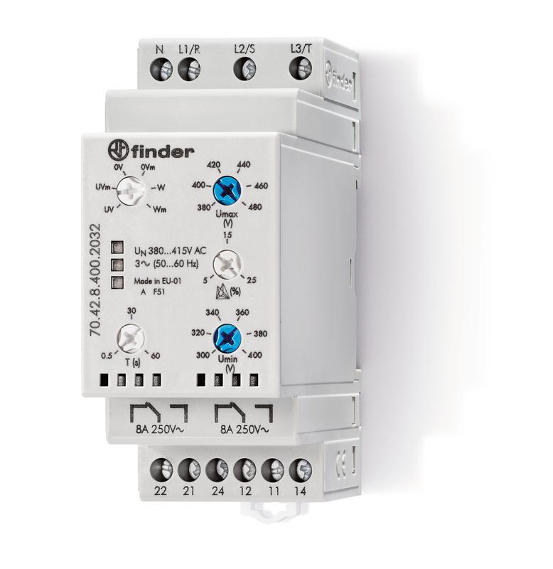 Реле контрольное для 3-фазных сетей пониженное/повышенное напряжение обрыв/чередование/асимметрия фаз контроль нейтрали настраиваемые диапазоны выход 2CO 8А 35мм IP20 FINDER 704284002032