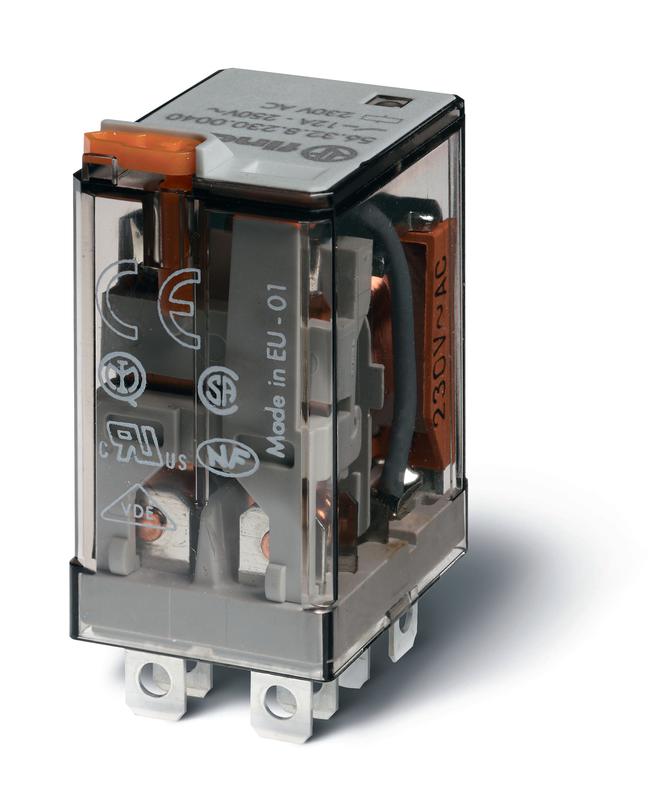 Реле миниатюрное силовое электромеханич. монтаж в розетку или наконечники Faston (4.8х0.5мм) 2CO 12А AgNi 230В AC RTI опции: кнопка тест + мех. индикатор FINDER 563282300040