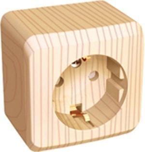 Розетка Systeme Electric (ранее Schneider Electric) ЭТЮД (сосна, открытой установки) одноместная, с заземлением и шторками предназначена для применения в сетях до 250В, на ток до 16А. Шторки открываются при одновременном давлении в оба отверстия и препятствуют проникновению посторонних предметов. Они обеспечивают дополнительную безопасность в доме, где находятся дети. Изделия цвета Сосна обладают уникальным рисунком, напоминающим древесный сруб. Сделано в России.