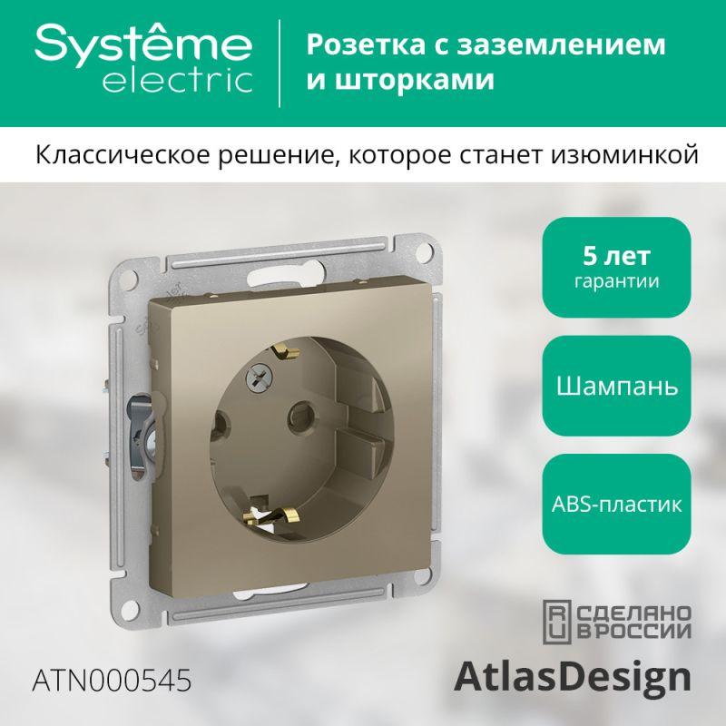 Механизм Systeme Electric (ранее Schneider Electric) серии AtlasDesign в цвете шампань розетки одинарной с заземлением и шторками подходит для сетей 250 В, на ток 16 А. - Заземляющий контакт обеспечивает дополнительную защиту от удара электрическим током. При наличии заземления электрический потенциал уходит в землю, защищая человека. - Лицевые детали из качественного ABS-пластика, устойчивого к царапинам и УФ-излучению. - Усиленные прямые монтажные лапки для лучшей фиксации механизма в монтажной коробке.