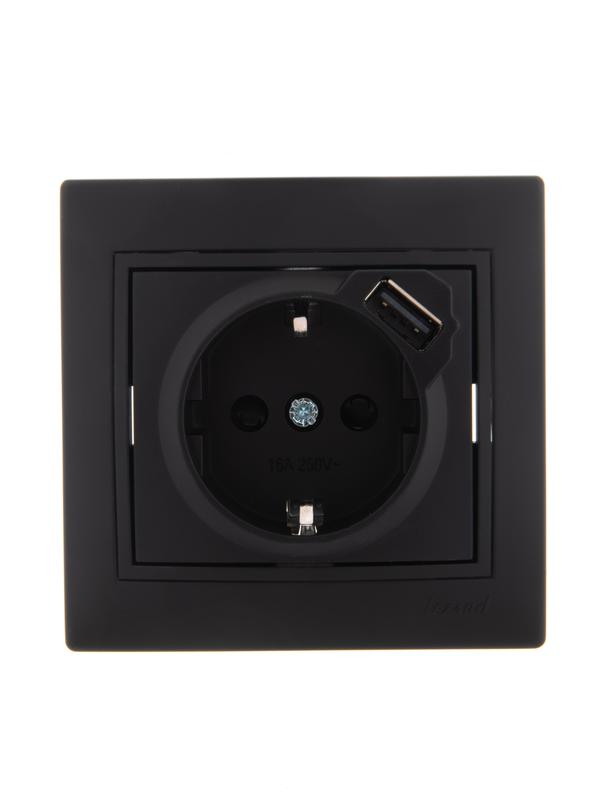 Розетка 1-м СП Mira 16А с заземл. + USB разъем черн. бархат LEZARD 701-4242-181