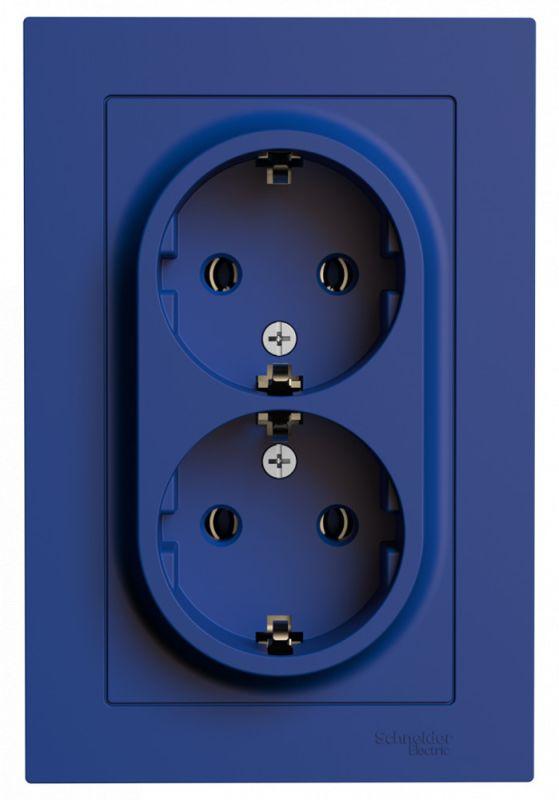 Розетка двойная Systeme Electric (ранее Schneider Electric) серии AtlasDesign (в сборе, цвет аквамарин) с заземлением, без шторок подходит для сетей 250 В, на ток 16 А. - Заземляющий контакт обеспечивает дополнительную защиту от удара электрическим током. - Лицевые детали из качественного ABS-пластика, устойчивого к царапинам и УФ-излучению. - Двойная розетка позволяет подключить два устройства в одном месте. - Изделие поставляется в комплекте с рамкой того же цвета.
