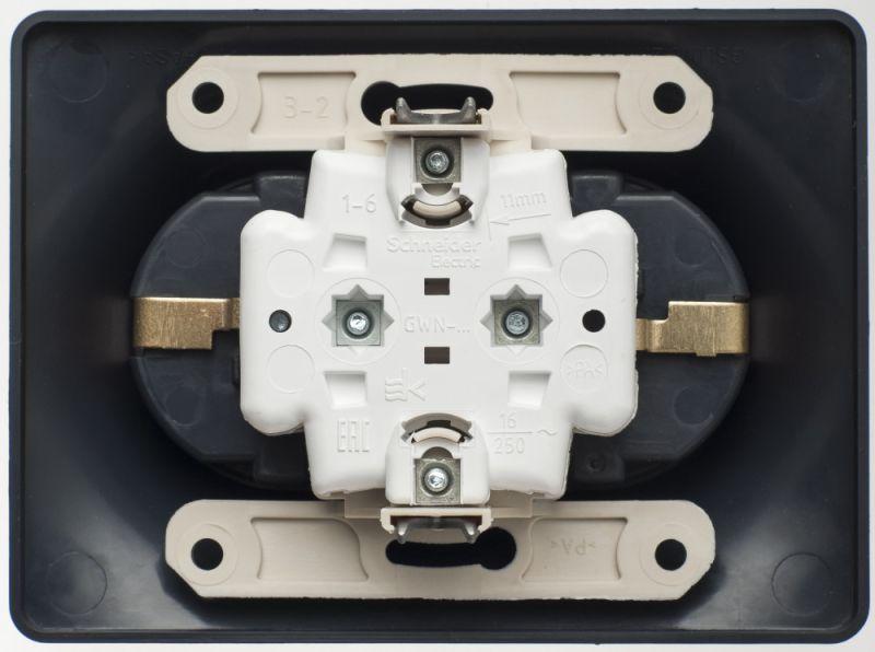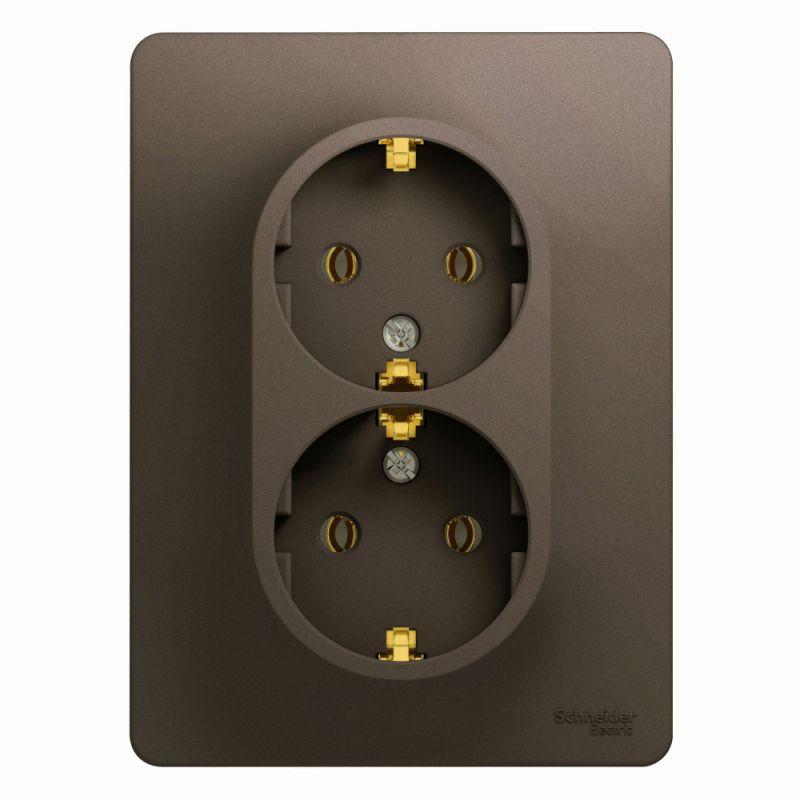 Розетка двойная Systeme Electric (ранее Schneider Electric) серии Glossa (в сборе, цвет шоколад) с заземлением, без шторок подходит для сетей 250 В, на ток 16 А. - Заземляющий контакт обеспечивает дополнительную защиту от удара электрическим током. При наличии заземления электрический потенциал уходит в землю, защищая человека. - Выполнен из материала PС+ASA, стойкого к УФ-излучению и появлению царапин. - Двойная розетка позволяет подключить два устройства в одном месте.