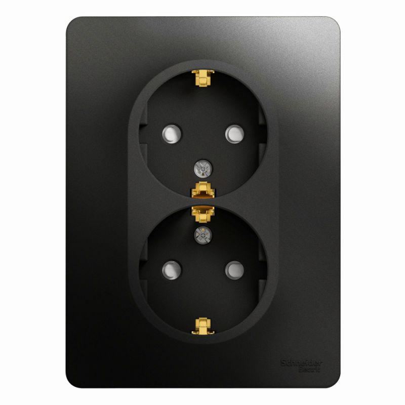 Розетка двойная Systeme Electric (ранее Schneider Electric) серии Glossa (в сборе, цвет антрацит) с заземлением и шторками подходит для сетей 250 В, на ток 16 А. - Заземляющий контакт обеспечивает дополнительную защиту от удара электрическим током. При наличии заземления электрический потенциал уходит в землю, защищая человека. - Выполнен из материала PС+ASA, стойкого к УФ-излучению и появлению царапин. - Двойная розетка позволяет подключить два устройства в одном месте.