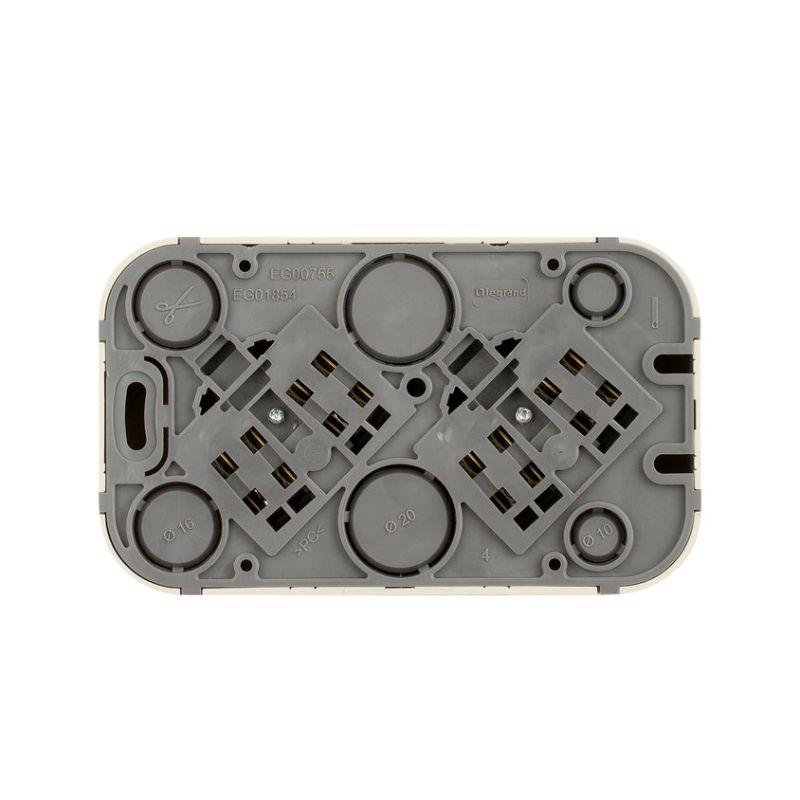 Двойная розетка с заземлением, со шторками Legrand Quteo, цвет белый, для открытого монтажа. Максимальный ток 16 А, максимальная мощность 3680 Вт. Применяется в зданиях, оборудованных для повышения безопасности проводкой с заземлением (с защитным проводником). Рекомендуются к применению в помещениях в которых могут быть дети. Шторки осуществляют защитную функцию путём ограничения доступа к токоведущим контактам. Доступ открывается только при подключении вилки. Особенности - Все токоведущие части имеют защиту от случайного прикосновения. - Простота подключения. Что бы подключить весь блок, достаточно подвести питание к одной розетке, следуя схеме на упаковке. - Контактная группа изготовлена из латуни CuZn37, имеет высокую степень упругости и сохраняет плотный контакт с вилкой, при длительной эксплуатации. - Скоба заземления имеет особый профиль для большей упругости и долговечного, плотного контакта с вилкой. - Зажимы для присоединения проводников винтовые, с невыпадающими винтами. Исключают потерю винтов при монтаже. - Внешний корпус крепится к механизму винтом. Особенности серии Quteo - Современный формат накладного монтажа - Механизм изготовлены из высококачественного поликарбоната, не проводит электрический ток, не поддерживает горение. - Простое выравнивания изделий при установке в ряд,благодаря специальной форме основания. - Корпус ударопрочный из пластичного полипропилена стойкого к внешним воздействиям. - Перфорация на корпусе для безошибочного вырезания отверстий при монтаже открытой проводки - В основании преднарезаны 4 отверстия для подвода кабеля при монтаже скрытой проводки
