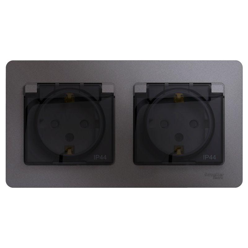 Розетка Systeme Electric (ранее Schneider Electric) серии Glossa (в сборе, цвет графит) двойная с заземлением, шторками и крышкой подходит для сетей 250 В, на ток 16 А. - Изделие со степенью защиты IP44 обеспечит безопасность использования в ванной и на кухне. - Заземляющий контакт обеспечивает дополнительную защиту от удара электрическим током. При наличии заземления электрический потенциал уходит в землю, защищая человека. - Выполнен из материала PС+ASA, стойкого к УФ-излучению и появлению царапин.
