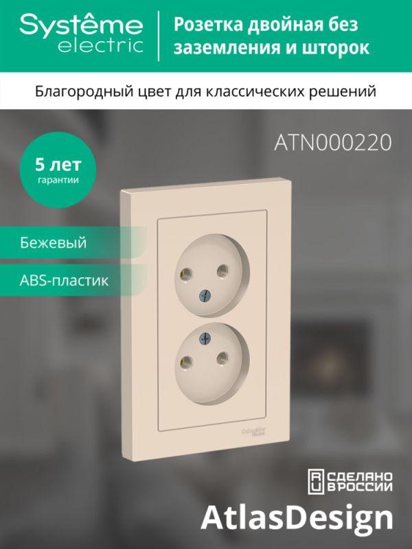 Розетка двойная Systeme Electric (ранее Schneider Electric) серии AtlasDesign (в сборе, цвет бежевый) без заземления и без шторок подходит для сетей 250 В, на ток 16 А. - Лицевые детали из качественного ABS-пластика, устойчивого к царапинам и УФ-излучению. - Усиленные прямые монтажные лапки для лучшей фиксации механизма в монтажной коробке. - Двойная розетка позволяет подключить два устройства в одном месте. - Изделие поставляется в комплекте с рамкой того же цвета.