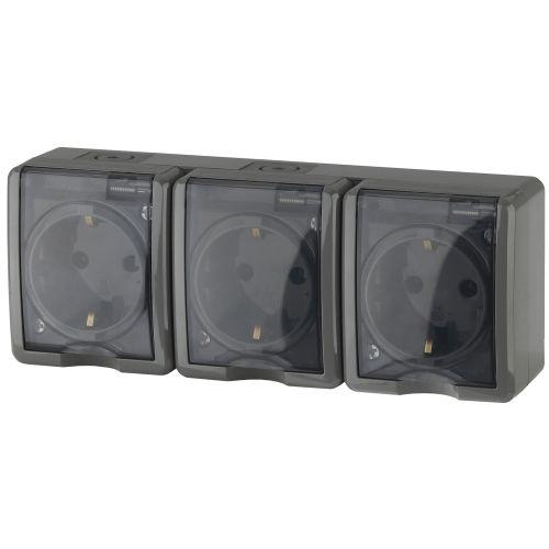Розетка тройная IP54 3-я серии Эра Эксперт открытой установки цвет серый 11-2405-03. Номинальные характеристики 16А 250В . Устройство выполнено из качественного поликарбоната, оснащёно уникальными винтовыми клеммами ЭКСПЕРТ для максимально качественного зажима кабеля в механизме.