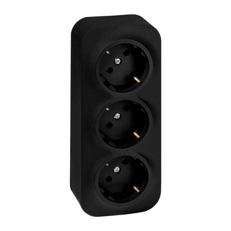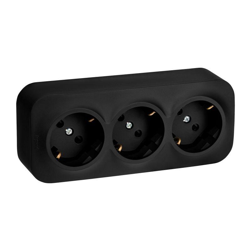 "Розетка трёхместная с заземлением с защитными шторками накладного (открытого) монтажа с предварительным подключением Legrand Quteo, цвет ""Чёрный матовый"", степень защиты IP20, номинальный ток 16A, напряжение ~250В, максимальная мощность 3680Вт, винтовые зажимы. Устанавливается в жилых и общественных помещениях. Применяется для электропитания в зданиях с проводкой с заземлением (с защитным проводником). Шторки осуществляют защитную функцию путём ограничения доступа к токоведущим контактам. Доступ открывается только при подключении вилки. Подходит как для скрытой, так и для открытой проводки. Идеальная совместимость с кабельными мини-каналами Metra. Особенности изделия: - Глубокий матовый чёрный цвет - Окрашено по технологии, используемой в автомобильной промышленности (стойкий к износу и повреждениям) - Не оставляет отпечатков пальцев и имеет приятную тактильность - Все розетки в блоке соединены между собой токоведущими шинами, что обеспечивает быстрый монтаж - Гнёзда розеток расположены под углом 45°: удобное подключение вилок различного типа - Контактная группа изготовлена из латуни CuZn37, имеет высокую степень упругости и сохраняет плотный контакт с вилкой, при длительной эксплуатации - Скоба заземления имеет особый профиль для большей прочности - Зажимы для присоединения проводников винтовые, с невыпадающими винтами, что исключает их потерю при монтаже - Все токоведущие части розетки имеют защиту от случайного прикосновения - Механизм изготовлен из высококачественного поликарбоната: обладает высокой электробезопасностью, не поддерживает горение - Простое выравнивание изделий при установке в ряд,благодаря специальной форме основания - Корпус ударопрочный из пластичного поликарбоната, стойкого к внешним воздействиям, экологичного и безопасного - Корпус крепится к механизму винтами - Перфорация на корпусе для безошибочного вырезания отверстий при монтаже открытой проводки - В основании преднарезаны 4 отверстия для подвода кабеля при монтаже скрытой проводки"