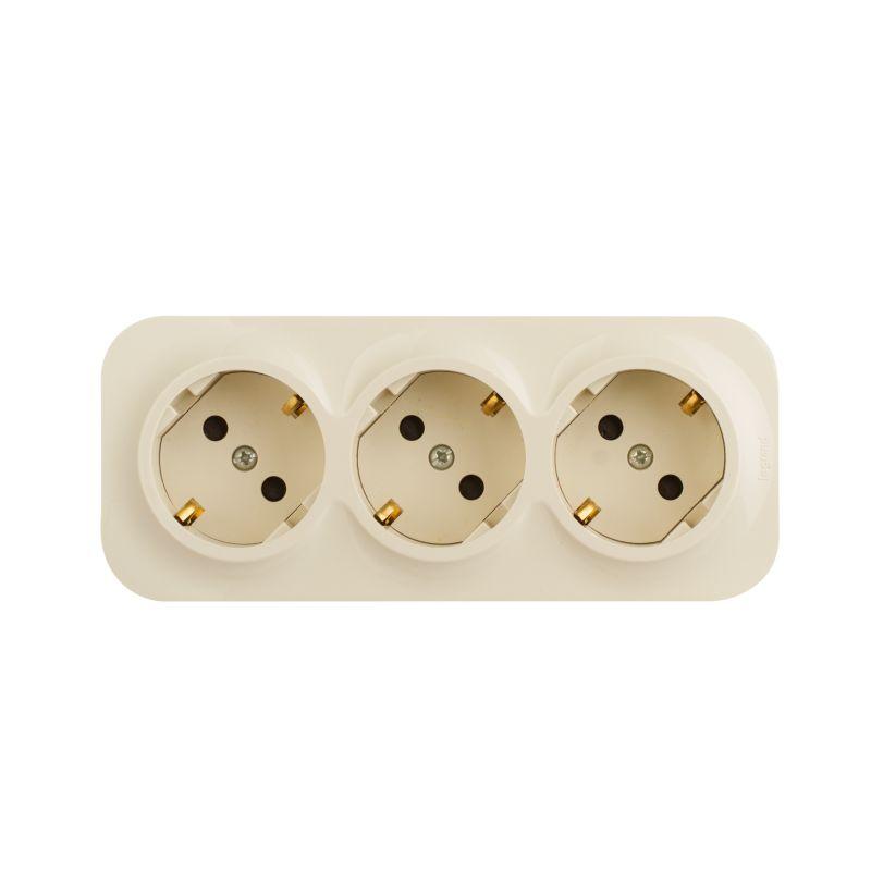 Тройная розетка с заземлением, со шторками Legrand Quteo, цвет слоновая кость, для открытого монтажа. Максимальный ток 16 А, максимальная мощность 3680 Вт. Применяется в зданиях, оборудованных для повышения безопасности проводкой с заземлением (с защитным проводником). Рекомендуются к применению в помещениях в которых могут быть дети. Шторки осуществляют защитную функцию путём ограничения доступа к токоведущим контактам. Доступ открывается только при подключении вилки. Особенности - Все токоведущие части имеют защиту от случайного прикосновения. - Простота подключения. Что бы подключить весь блок, достаточно подвести питание к одной розетке, следуя схеме на упаковке. - Контактная группа изготовлена из латуни CuZn37, имеет высокую степень упругости и сохраняет плотный контакт с вилкой, при длительной эксплуатации. - Скоба заземления имеет особый профиль для большей упругости и долговечного, плотного контакта с вилкой. - Зажимы для присоединения проводников винтовые, с невыпадающими винтами. Исключают потерю винтов при монтаже. - Внешний корпус крепится к механизму винтом. Особенности серии Quteo - Современный формат накладного монтажа - Механизм изготовлены из высококачественного поликарбоната, не проводит электрический ток, не поддерживает горение. - Простое выравнивания изделий при установке в ряд,благодаря специальной форме основания. - Корпус ударопрочный из пластичного полипропилена стойкого к внешним воздействиям. - Перфорация на корпусе для безошибочного вырезания отверстий при монтаже открытой проводки - В основании преднарезаны 4 отверстия для подвода кабеля при монтаже скрытой проводки