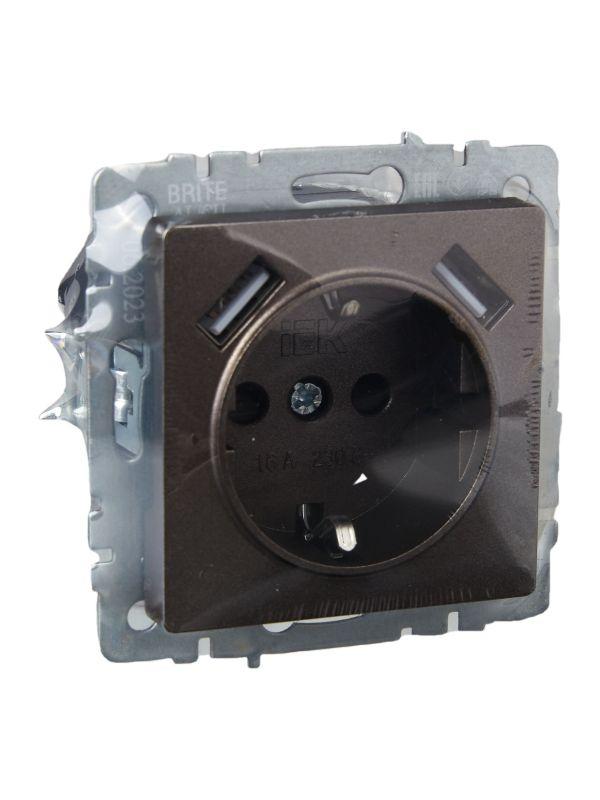 Розетка BRITE РЮш10-1-БрТБ 16А с USB A+A 2.1А с заземл. защ. шторки темн. механизм бронза IEK BR-R14-16-U21-D21-K45