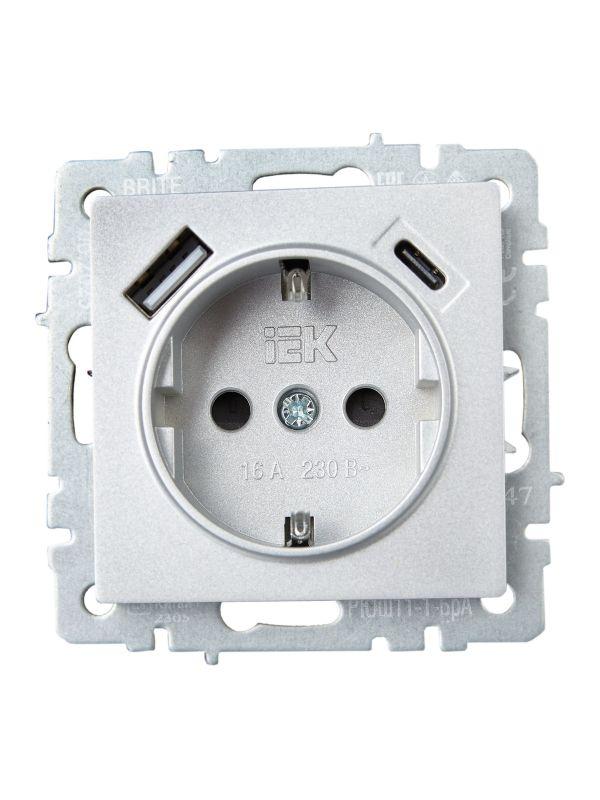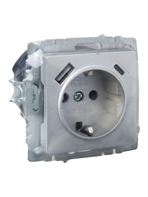 Розетка BRITE РЮш11-1-БрА 16А с USB A+C 18Вт с заземл. защ. шторки механизм алюм. IEK BR-R14-16-U22-018-K47