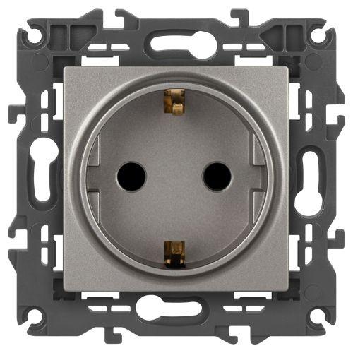 Розетка с заземлением и шторками серии Эра Elegance цвет титан 14-2102-16. Характеристики 16А 250В. Оснащена автоматическими клеммами для надёжной фиксации жил кабеля в механизме. Рамки приобретаются отдельно.