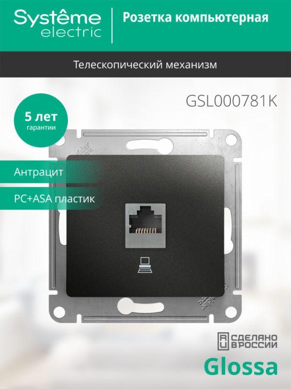 Механизм Systeme Electric (ранее Schneider Electric) серии Glossa (цвет антрацит) розетки компьютерной с разъёмом RJ45 категория 5е предназначен для удобного и быстрого подключения вашего компьютера к компьютерной сети. - Выполнен из материала PС+ASA, стойкого к УФ-излучению и появлению царапин.