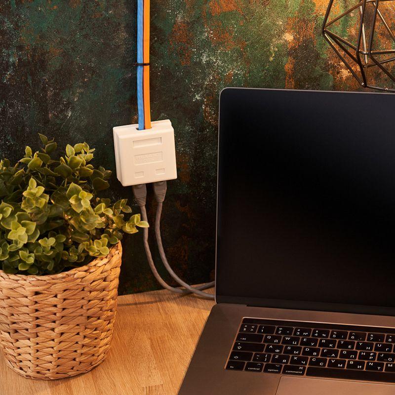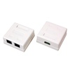 Сетевая розетка LAN предназначена для подключения компьютерных и телефонных кабелей к сети. Выполнена в белом цвете, оснащена двумя гнездами RJ-45 под разъем 8Р8С (8 посадочных мест и 8 контактов). Кабель фиксируется с помощью зажимных контактов. Розетка имеет квадратную форму и устанавливается непосредственно на поверхность стены. Предназначена для размещения в помещениях.