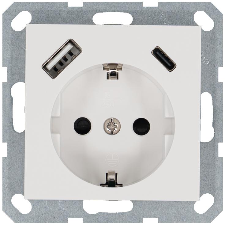 Розетка Shuko 16А с заземл. защ. шторки с 2-мя заряд. устройствами USB тип A+C 25Вт механизм бел. глянцевый Jasmart G5501USB-25W