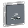 Механизм Systeme Electric (ранее Schneider Electric) серии AtlasDesign в цвете грифель розетки для зарядки с двумя разъёмами USB с выходными напряжением 5 В постоянного тока и выходами с номинальным током по 2,1 А. - USB розетка позволяет напрямую заряжать одно или два мобильных устройства. - Лицевые детали из качественного ABS-пластика, устойчивого к царапинам и УФ-излучению. - Усиленные прямые монтажные лапки для лучшей фиксации механизма в монтажной коробке.