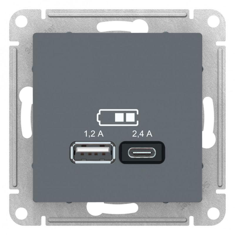 Розетка Systeme Electric (ранее Schneider Electric) серии AtlasDesign в цвете грифель двойная USB с разъемами типа A+C - Лицевые детали из качественного ABS-пластика, устойчивого к царапинам и УФ-излучению. - Самая современная USB-зарядка с двумя разъемами позволяет заряжать как стандартные мобильные устройства через разъем типа А, так и новейшие устройства, в том числе ноутбуки, с разъемом типа С.