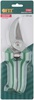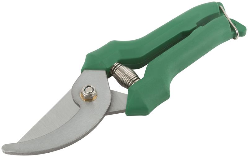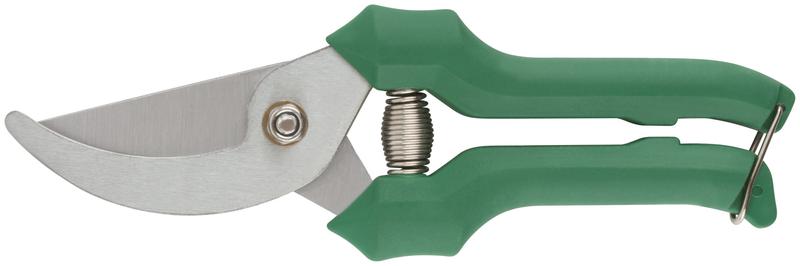 Секатор. С проволочной пружиной и скобойфиксатором. Режущие кромки внахлест. Для обрезания побегов и веток толщиной до 20 мм. Материал: лезвия из инструментальной стали, пластиковые ручки. Упаковка: блистер.