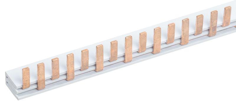Обеспечивают удобное и быстрое соединение групп дифференциальных автоматических выключателей серии АВДТ32М со смещенным расположением вводных клемм. Шины, рассчитанные на номинальный ток 63 А, могут быть использованы с номинальным током 100 А, если вводной автомат подключать по центру. Шина для АВДТ32М на 108 модулей имеет выводы PIN через каждые 9мм (схема расположения модулей 1/2+1/2).