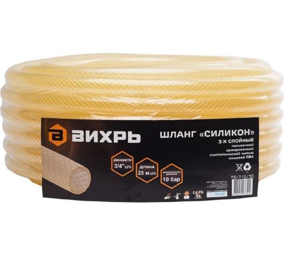 "Шланг поливочный трёхслойный армированный Вихрь предназначен для подачи воды на дачных участках. Эластичный силикон хорошо держит форму, не перекручивается. Шланг армирован синтетической нитью, держит давление 10 бар, диаметр 3/4 дюйма, длина шланга 25 метров. Шланг устойчив к воздействию УФ-излучения и не подвержен гниению."