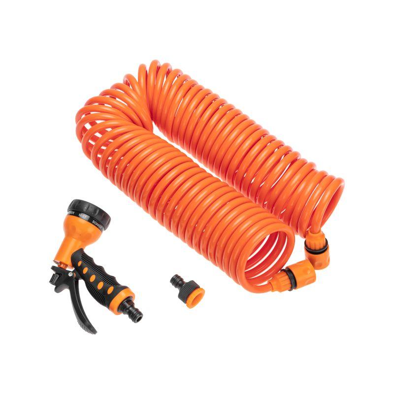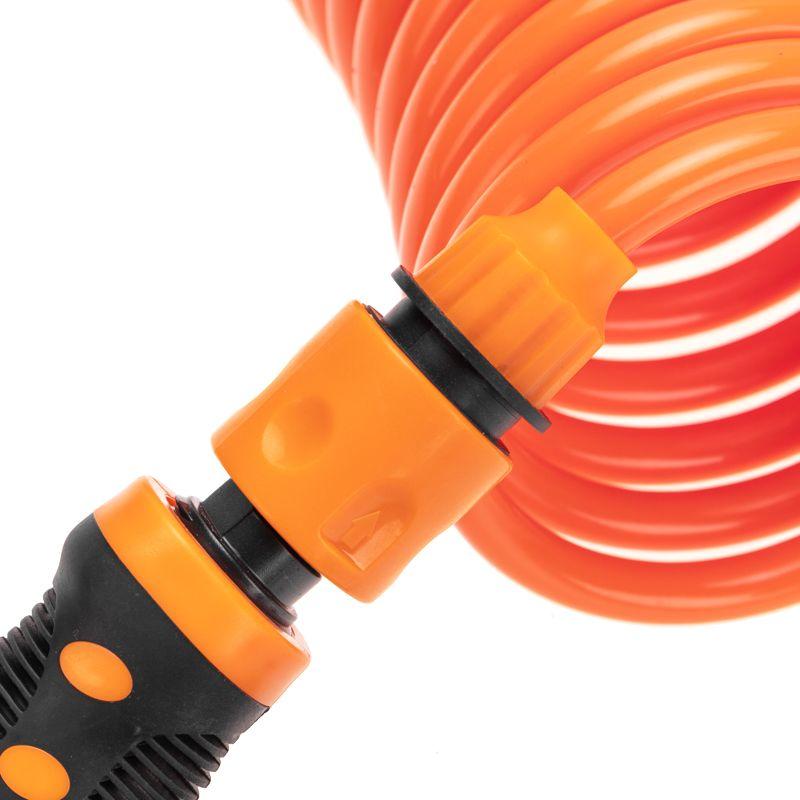 Шланг предназначен для полива газонов, клумб и почвы на садово-огородных участках. Отличается удобством, гибкостью и функциональностью, что делает его незаменимым помощником в уходе за растениями и создании здоровой и ухоженной зеленой зоны. Спиральная структура позволяет шлангу удлиняться при использовании, обеспечивая удобство в работе и минимизируя вероятность спутывания. Также в комплекте поставляются: пистолет-распылитель, 2 коннектора и адаптер. Пистолет-распылитель с 7 режимами обеспечивает удобное регулировки интенсивности струи воды для выполнения разнообразных задач. Два коннектора позволяют легко и надежно подключить шланг к водопроводной системе или другим устройствам. Адаптер будет полезен в случае несовпадения размеров или типов подключения.