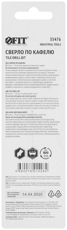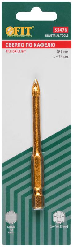 Сверло по кафелю 4 режущие кромки титан. покрытие U-хвостовик под биту 6х74мм FIT 35476
