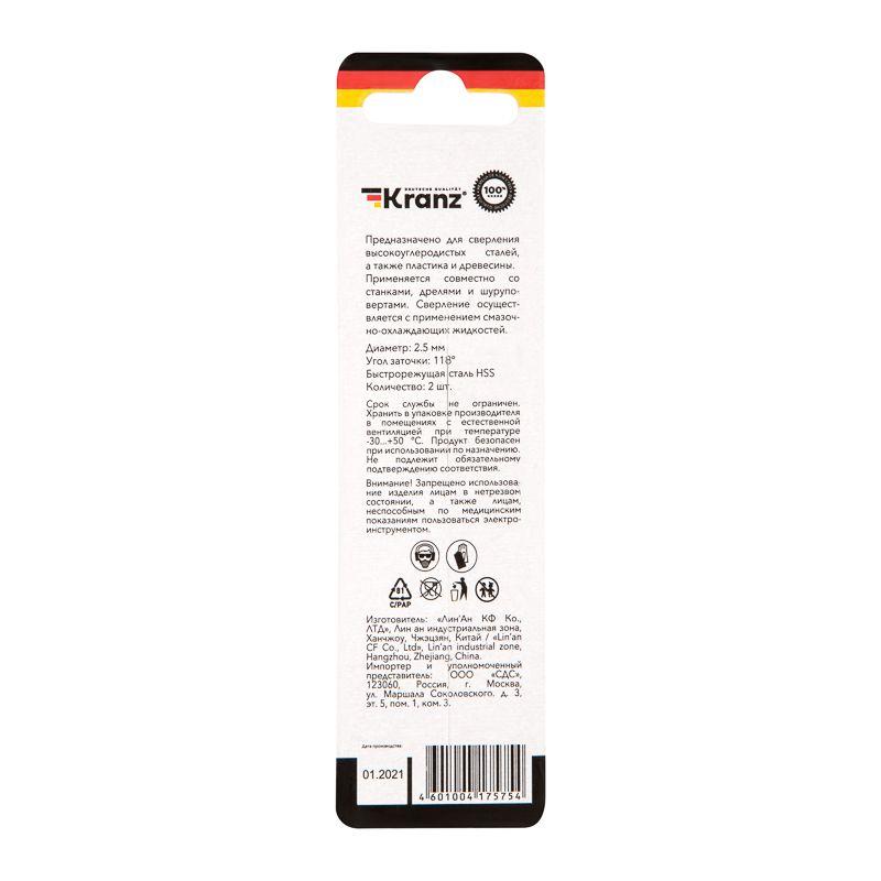 Сверло по металлу 2.5мм HSS DIN 338 (уп.2шт) Kranz KR-91-0554