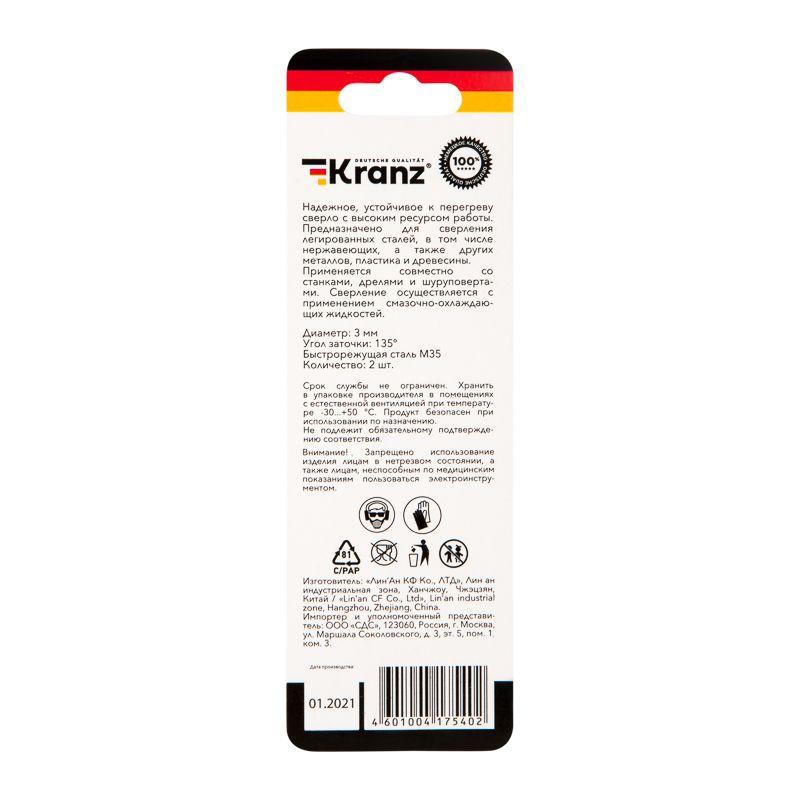 Сверло по металлу 3мм "Кобальт" (сталь HSS-Co 5% M35 P6M5K5) DIN 338 (блист.2шт) Kranz KR-91-0502