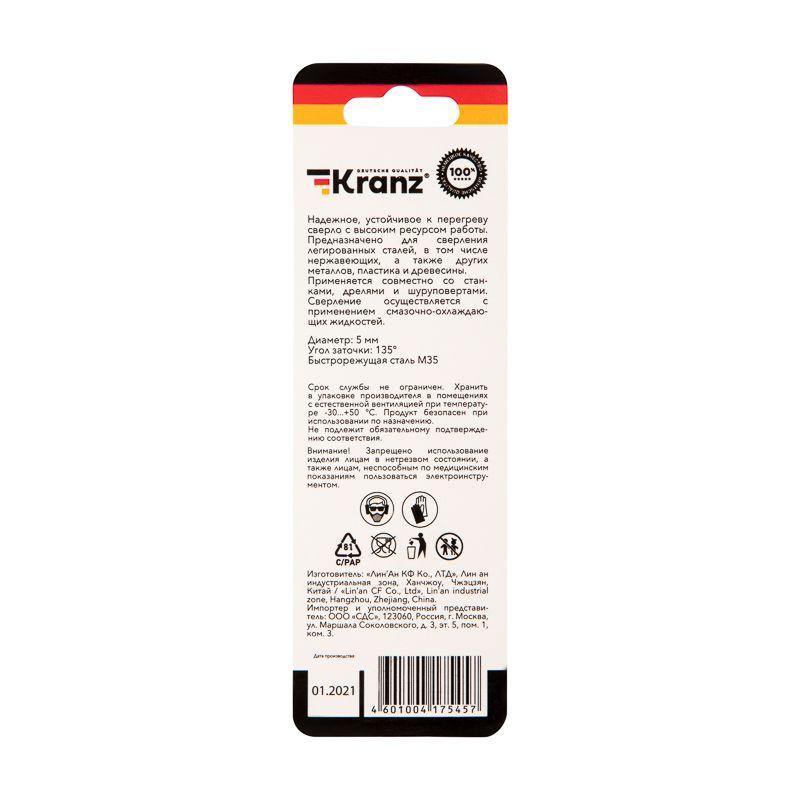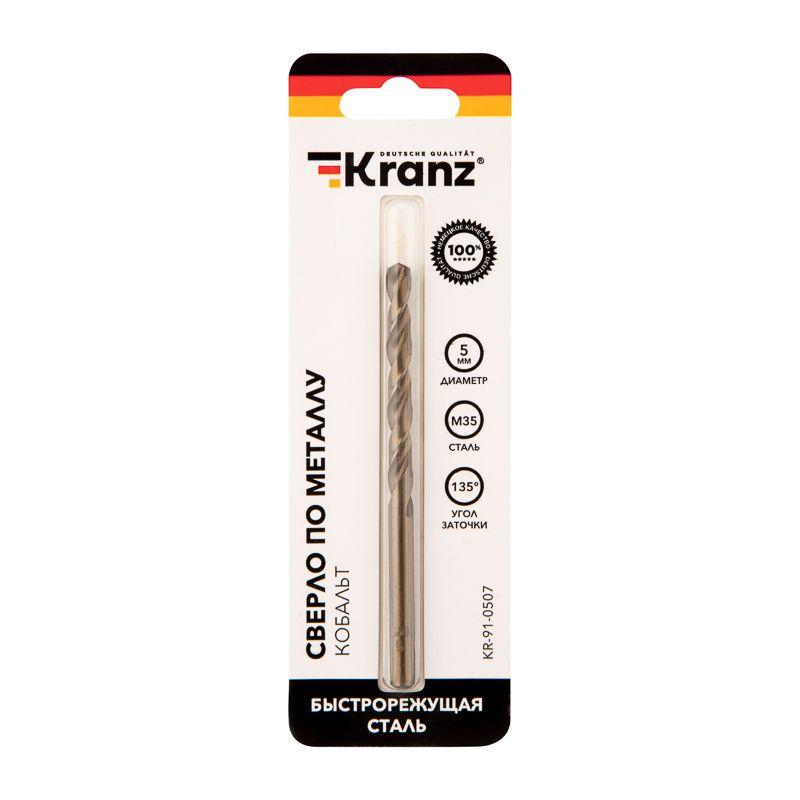 Сверло по металлу 5мм "Кобальт" (сталь HSS-Co 5% M35 P6M5K5) DIN 338 (блист.1шт) Kranz KR-91-0507