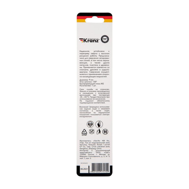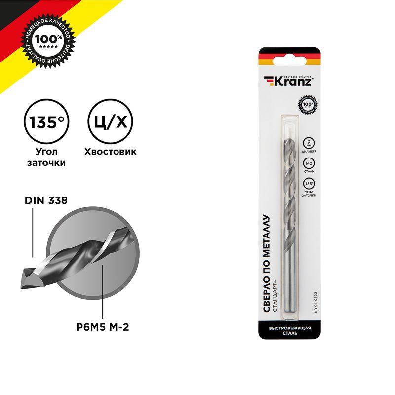 Сверло по металлу 9мм "Стандарт+" (P6M5 M-2) DIN 338 (блист.1шт) Kranz KR-91-0533