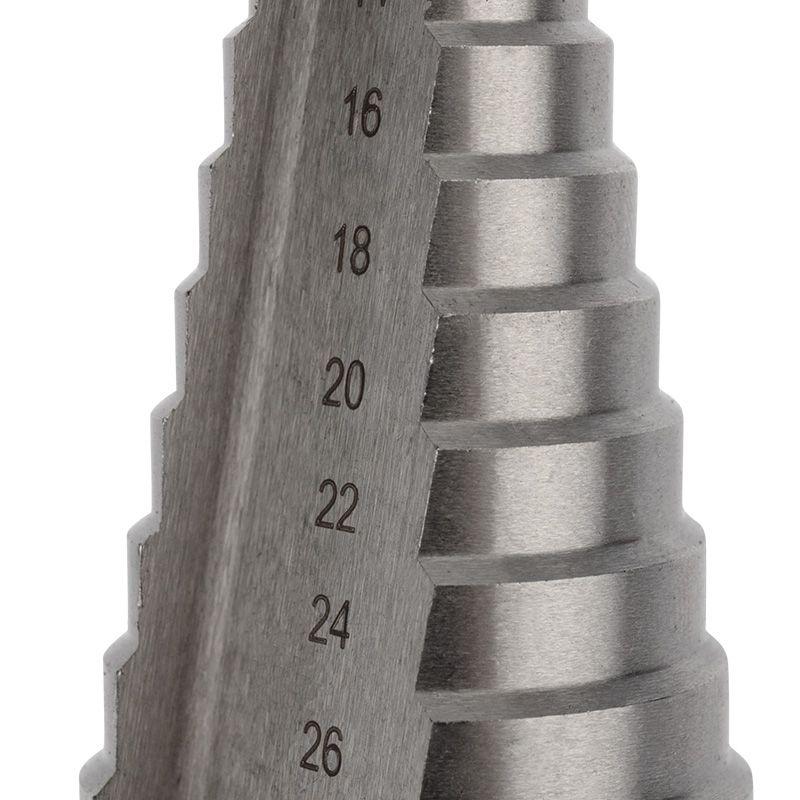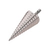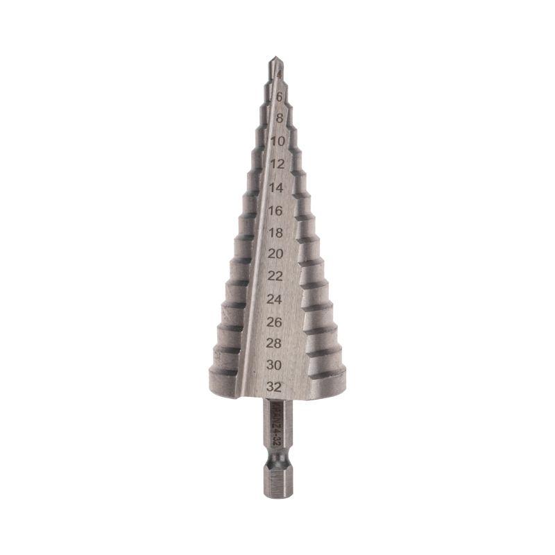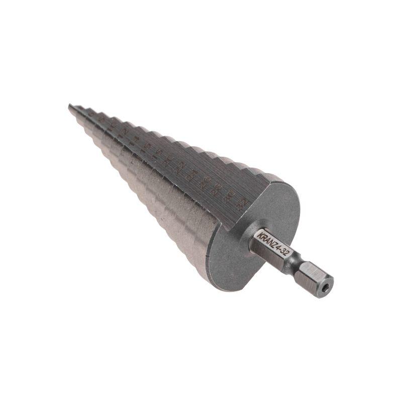 Ступенчатое сверло KRANZ применяется при выполнении монтажно-сборочных работ для сверления отверстий различных диаметров без перестановки режущего инструмента. Применяется в работе с такими материалами, как пластик, дерево, металл и др. Благодаря своей уникальной конструкции изделие заменяет целый набор традиционных спиральных сверл. Использование оснастки позволяет сэкономить время мастера, так как не требует предварительного кернения и сверления. Шестигранный хвостовик Е6,3 обеспечивает надежную фиксацию сверла во всех типах патронов шуруповертов и дрелей. Форма канавки – прямая. На каждой из 15 ступеней сверла нанесена маркировка фактического диаметра. Диапазон ступеней: 4, 6, 8, 10, 12, 14, 16, 18, 20, 22, 24, 26, 28, 30, 32 (шаг 2 мм). Сверло изготовлено из быстрорежущей инструментальной стали (HSS) и обладает высокой прочностью, а также устойчивостью к динамическим нагрузкам и перегреву.