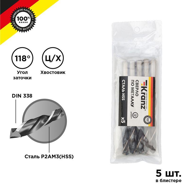 Сверло по металлу10.0мм HSS DIN 338 (уп.5шт) Kranz KR-91-0629