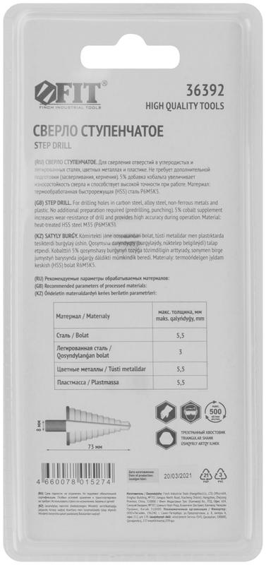 Ступенчатое сверло FIT HQ предназначено для сверления и рассверливания отверстий в листовых материалах (сталь, цветные металлы, пластик). Добавление кобальта в состав стали значительно увеличивает срок службы сверла и эффективность сверления. Сверла обладают высокой термостойкостью и износоустойчивостью, что гарантирует им увеличенный ресурс. Конструкция сверла обеспечивает улучшенный отвод отходов сверления.