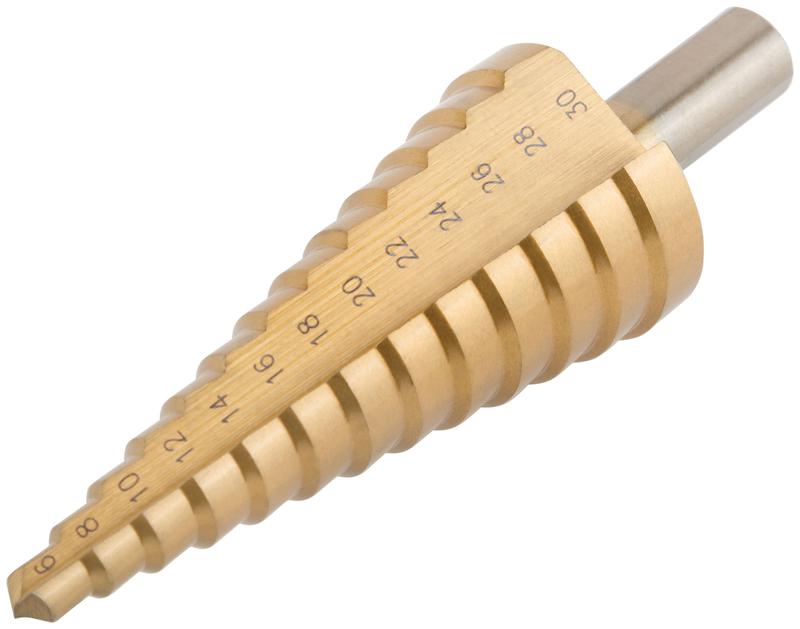 Сверло ступенчатое по металлу MOS предназначено для сверления и рассверливания отверстий в листовых материалах (сталь, цветные металлы, пластик). Покрытие из нитрида титана значительно увеличивает сопротивление перегреву во время сверления и, следовательно, срок службы сверла. Конструкция сверла обеспечивает улучшенный отвод отходов сверления.