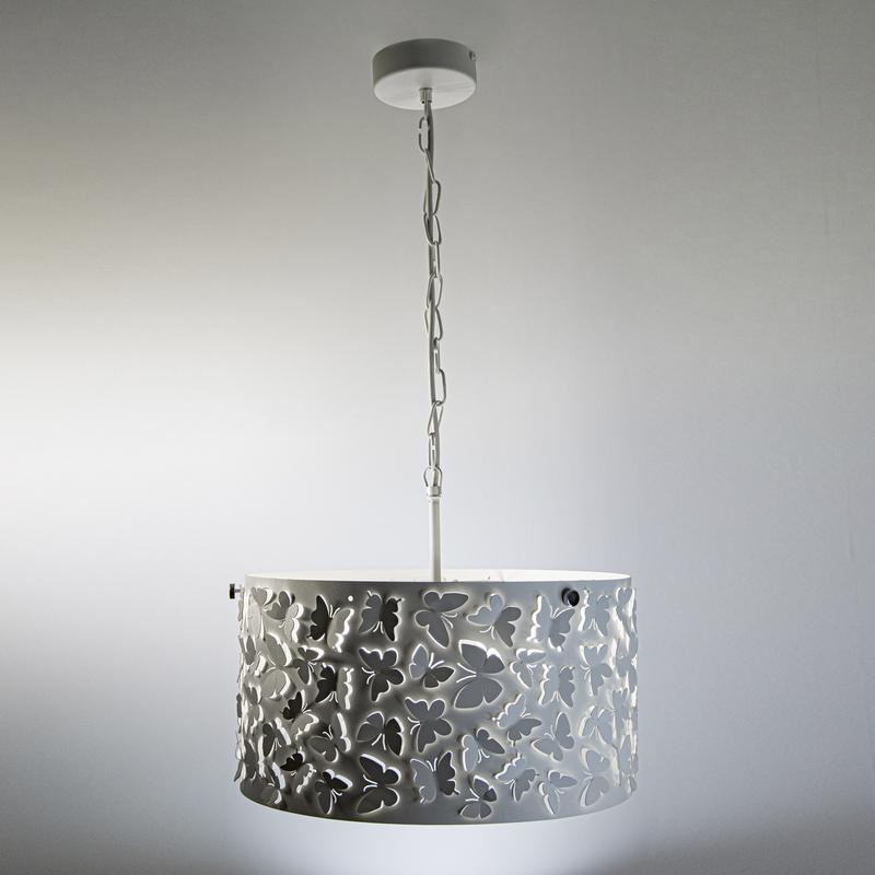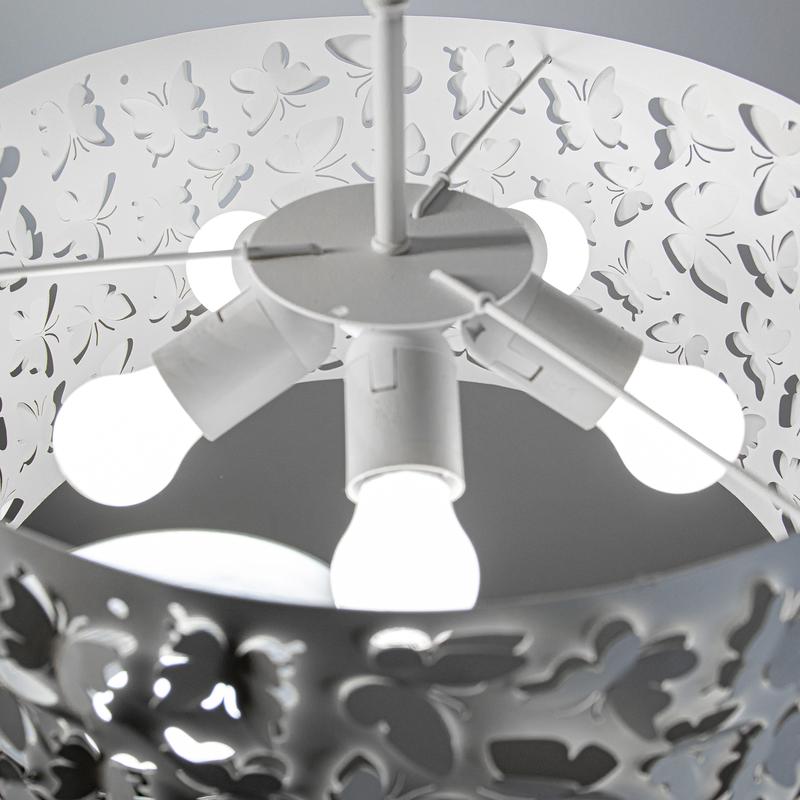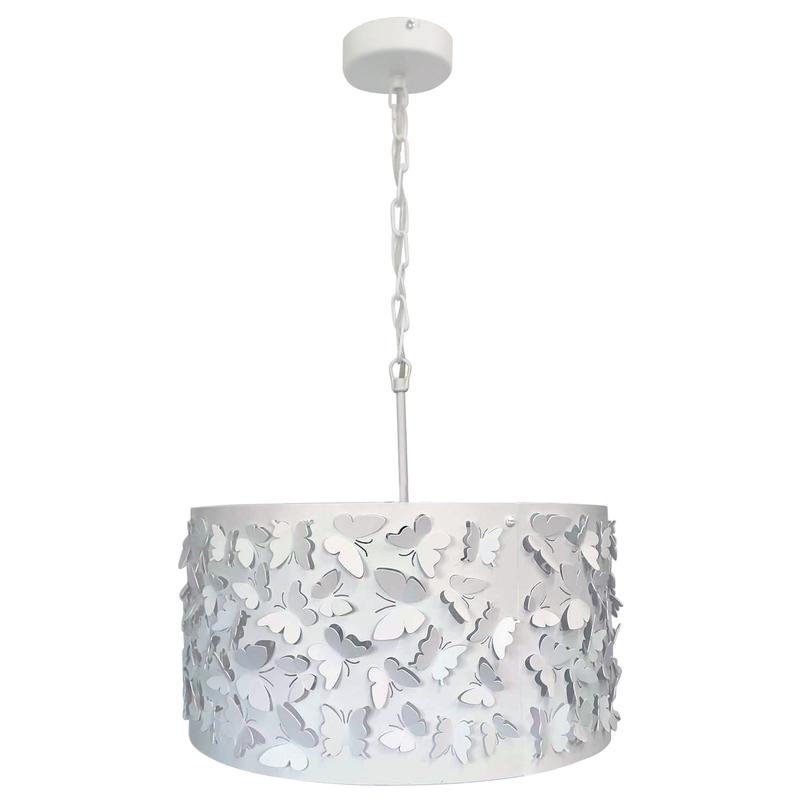 Подвесной светильник серии Эффект отлично подойдет для комнаты, оформленной в современном стиле. Резные элементы плафона в форме бабочек подчеркивают воздушность изделия, легко вписываются и в интерьер детской комнаты. Производитель рекомендует использовать лампу накаливания с цоколем E27 мощностью не более 60вт, а также светодиодные или энергосберегающие лампы. Для создания максимального декоративного эффекта можно использовать светодиодные лампочки RGB. Высота светильника вместе с плафоном 755 мм. Звенья цепи снимаются, провод подтягивается к потолочной чаше, за счет чего можно отрегулировать изделие по нужной высоте. Узел крепления на планку обеспечивает легкий монтаж, в т.ч. при устройстве натяжных потолков Рекомендуемая площадь освещения до 18м?. Лампочка в комплект не входит.
