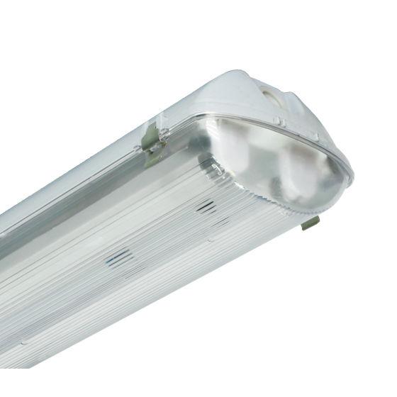 Светильник ЛСП 44-2х58-013 Flagman ЭПРА Ардатов 1044258013 предназначен для обеспечения общего освещения в условиях пыльных и сырых промышленных зданий, помещений с характерной химически агрессивной средой, с/х помещений, складов и мастерских, больниц, ванных и душевых комнат, кухонь, пожароопасных помещений. Корпус светильника выполнен из поликарбоната серого цвета. Расеиватель — из ударопрочного поликарбоната. Оптимальное распределение света обеспечивают празматические элементы, расположенные в средней части рассеивателя. Корпус смонтирован на съемную металлическую панель, окрашенную белой порошковой краской. Рассеиватель крепится к корпусу с помощью замков из поликарбоната. Между рассеивателем и корпусом есть уплотнителньая прокладка из пенополиуретана. Светильник монтируется на потолок как подвесной: на горизонтальную поверхность, стержень, серьгу. Технические характеристики: • тип источника света — люминесцентная лампа; • мощность источника света — 58Вт; • количество ламп — 2; • тип цоколя — G13; • степень защиты — IP65; • рабочее напряжение — 220-230В;