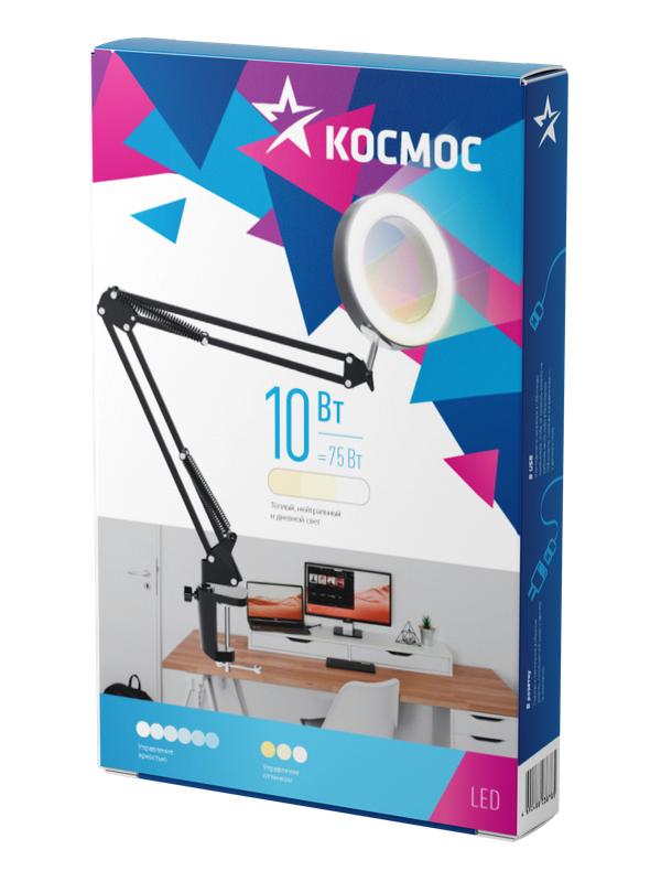 Светильник настольный Desk038. 10Вт 5В 2А RA>80 3 реж. цветности диммируемая струбцина черн. КОСМОС KOC_DESK038