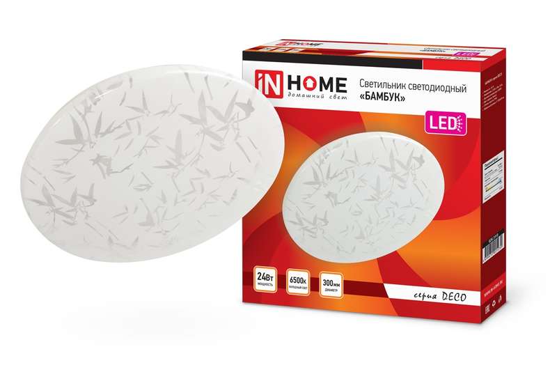 Светодиодный светильник БАМБУК серии DECO от ТМ In Home в светлом матовом корпусе украшен принтом в виде стилизованных листьев бамбука. Согласно древнему китайскому учению фен-шуй, изображение этого растения приносит в дом удачу, счастье и процветание. Линейка светильников БАМБУК представлена в диапазоне мощностей от 12 Вт до 48 Вт, что позволяют подобрать оптимальный осветительный прибор, в зависимости от конфигурации и габаритов помещения. Светодиодные светильники БАМБУК серии DECO предназначены для внутреннего освещения жилых помещений, подъездов и сферы ЖКХ, офисных и административных учреждений, магазинов, а также холлов, коридоров, лестничных пролётов, подсобок и других помещений вспомогательного назначения. Современные светильники серии DECO, работающие на основе последнего поколения светодиодов, обеспечивают яркий равномерный световой поток при максимальной экономии электроэнергии. Отсутствие пульсации гарантирует сохранность здоровья глаз. Светодиодные светильники являются одним из самых экологически безвредных источников света и не требуют специальной утилизации и переработки. Светильники получили сертификат таможенного союза EAC.
